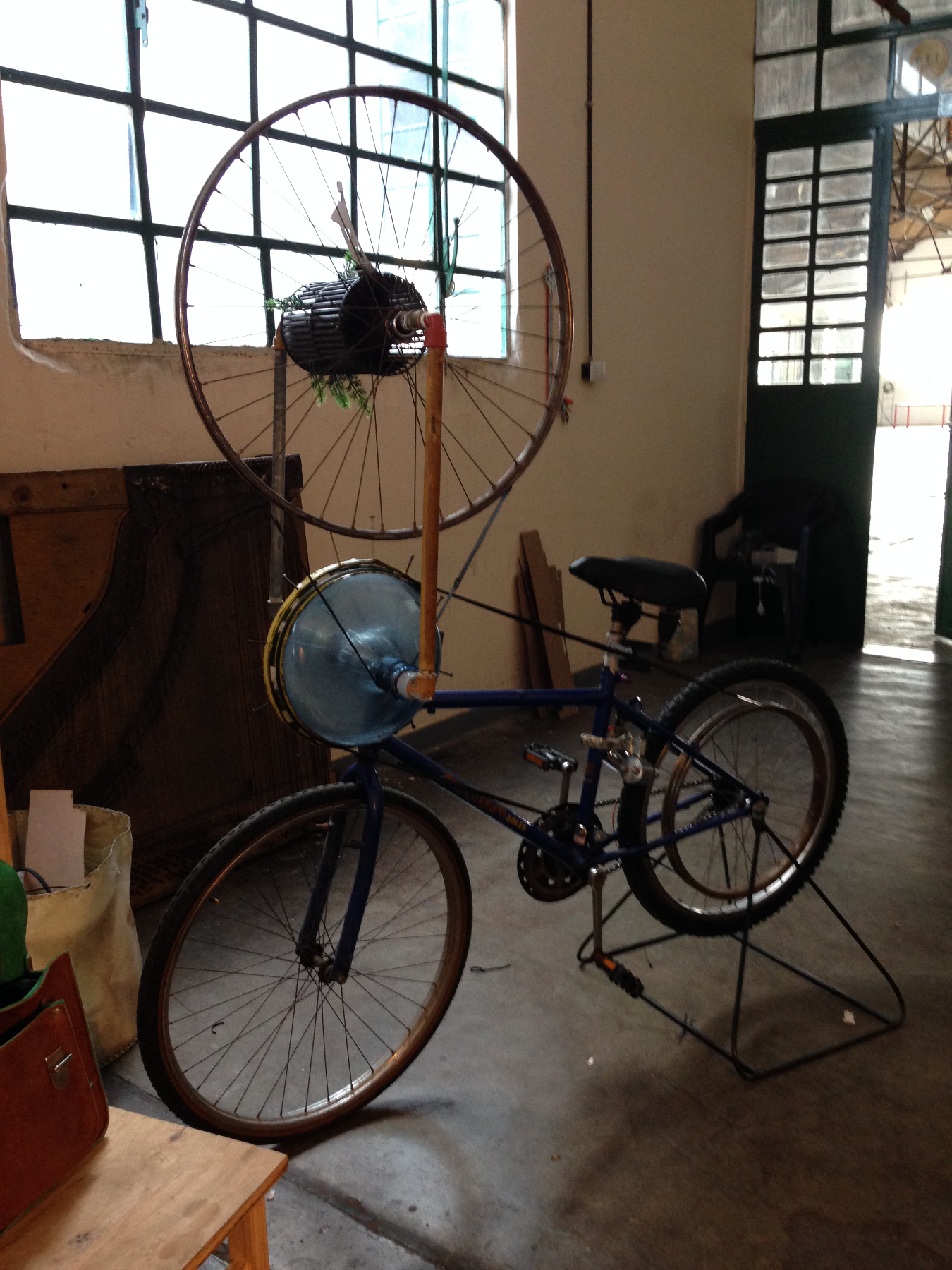 Primera bici nocturamica para teatro de sombras con un sistema de rodillos delantero traccionado por un sistema de objetos giratorios y correas recicladas que proyecta sombras en una pantalla de formato rectangular.